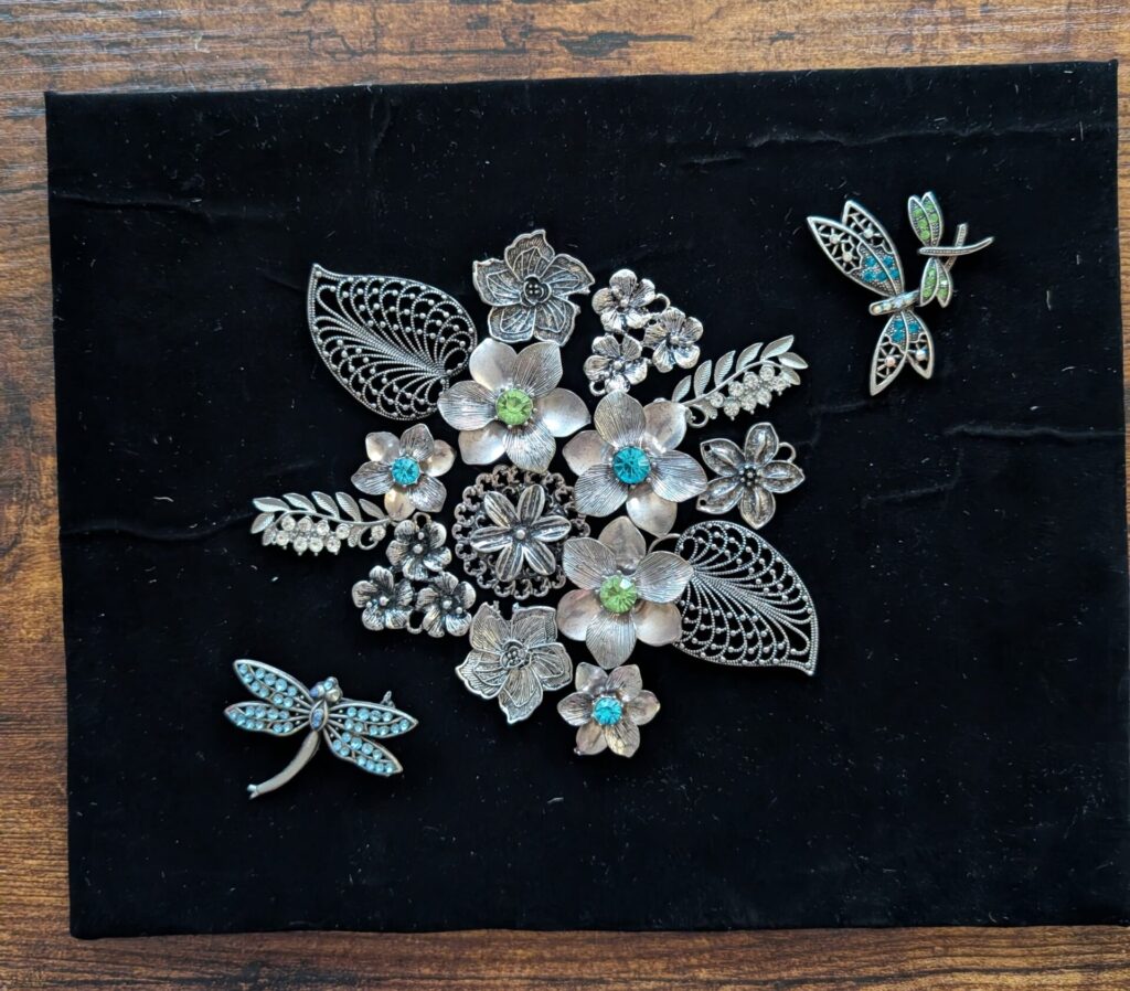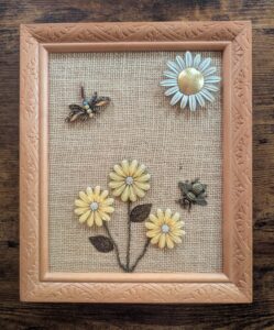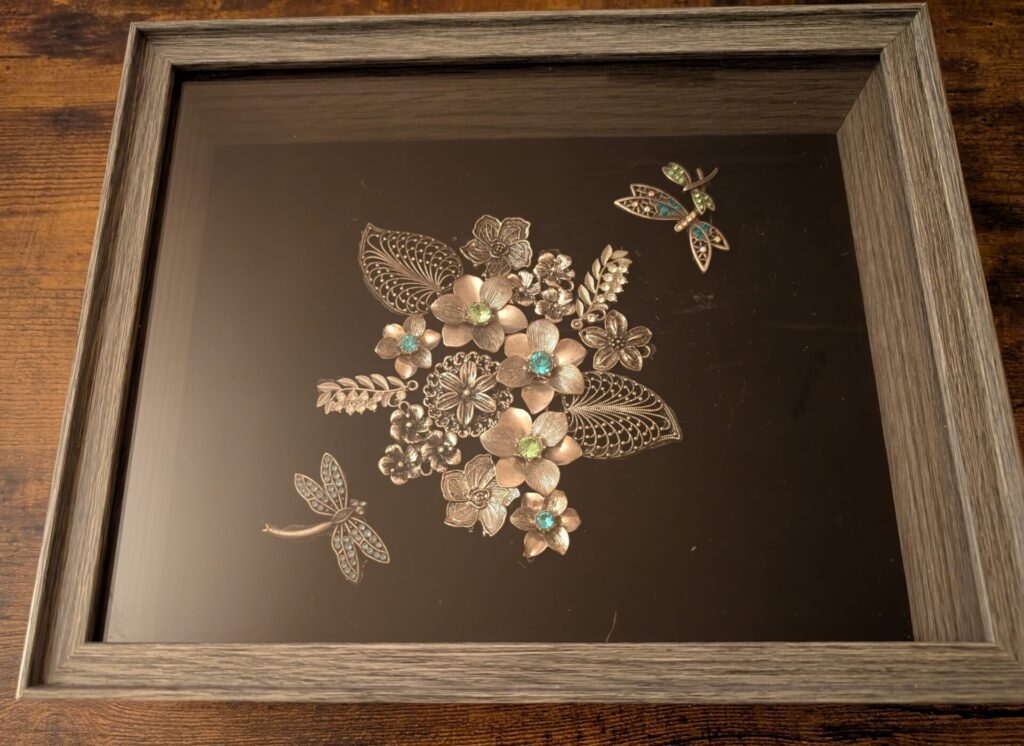 The first Jewelry Art piece featured yellow and white flowers to complement the design etched into the frame, bronze leaves, a bee, and a colorful dragonfly brooch.