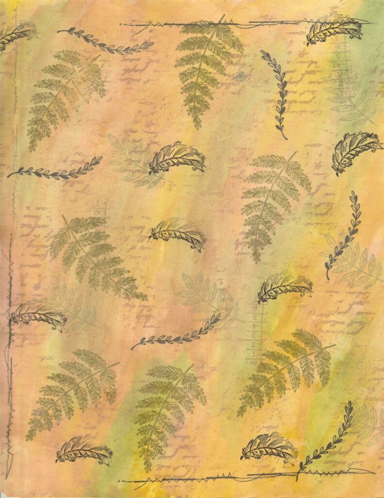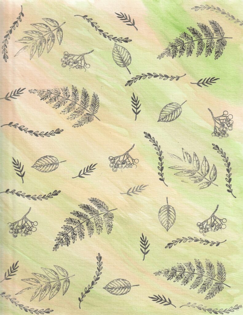 Once you are happy with the watercolor background, set it aside to dry thoroughly before stamping images over it. I used fern and leaf rubber stamps on a stamp block with colored Archival Ink and VersaMajic Dew Drops Chalk Ink.