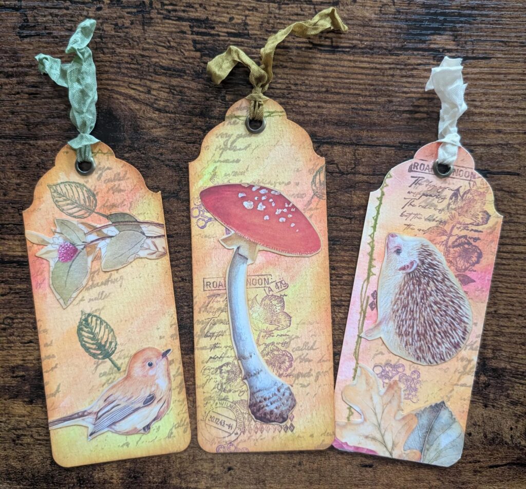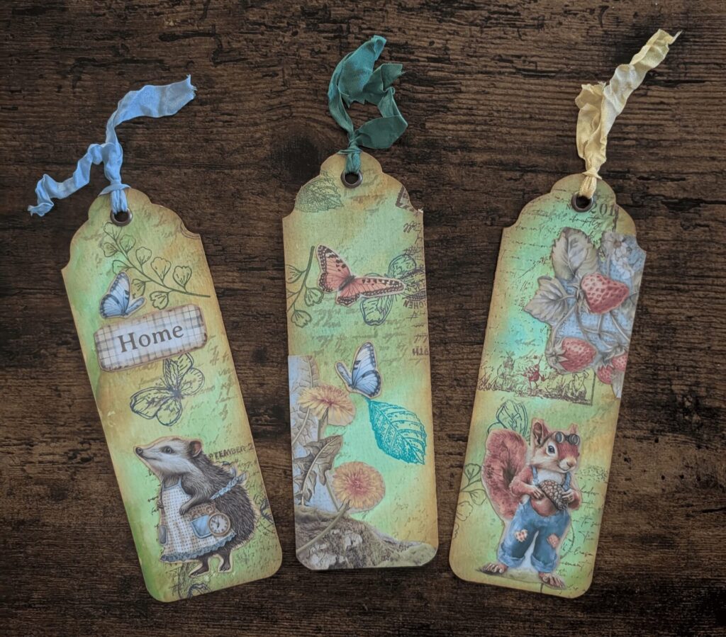 Once finished, I cut the watercolor background into tags for a Woodland Cardnial Junk Journal. I decorated the tags using ephemera from the Stamperia Woodland Romantic Collection. Gluing leaves and various woodland creatures to each tag, and then topping them with colored seam binding ribbon.