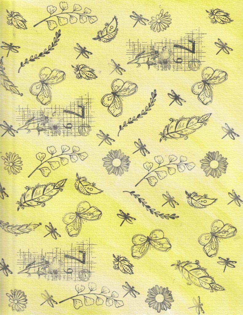 I got my paper, paints, brush, and water ready and started doodling nature-themed colors, hues of green, brown, yellow, and others on the page. Staying in the same direction while applying various colors, either near or overlapping, was very helpful.